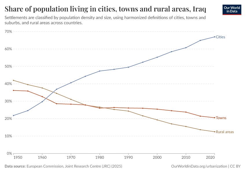 In the chart, you can see how the share of people in Iraq who live in rural areas, towns, and cities has changed over time.