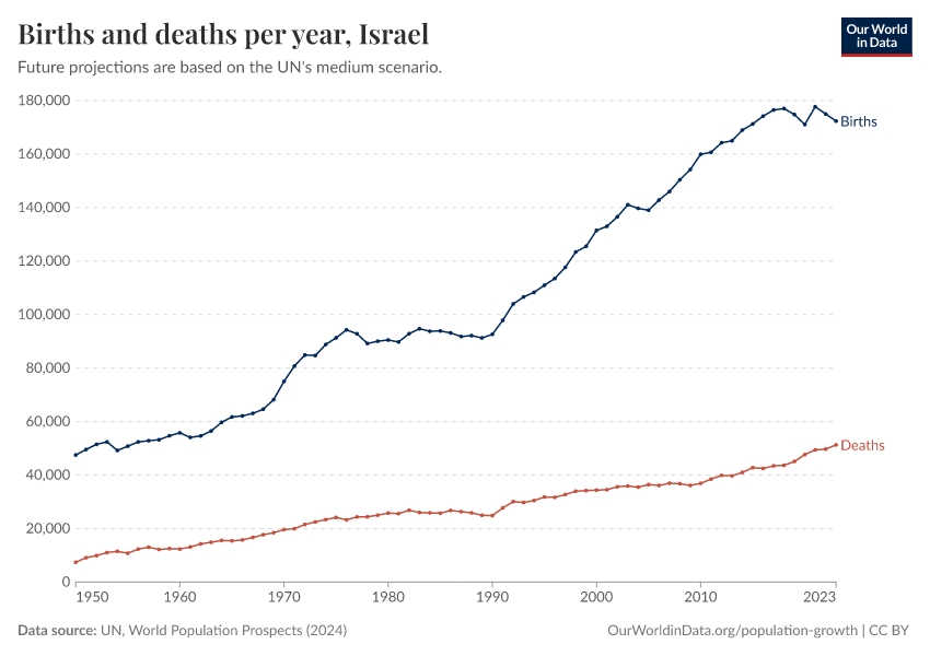 The chart below shows how births and deaths in Israel have changed over time.