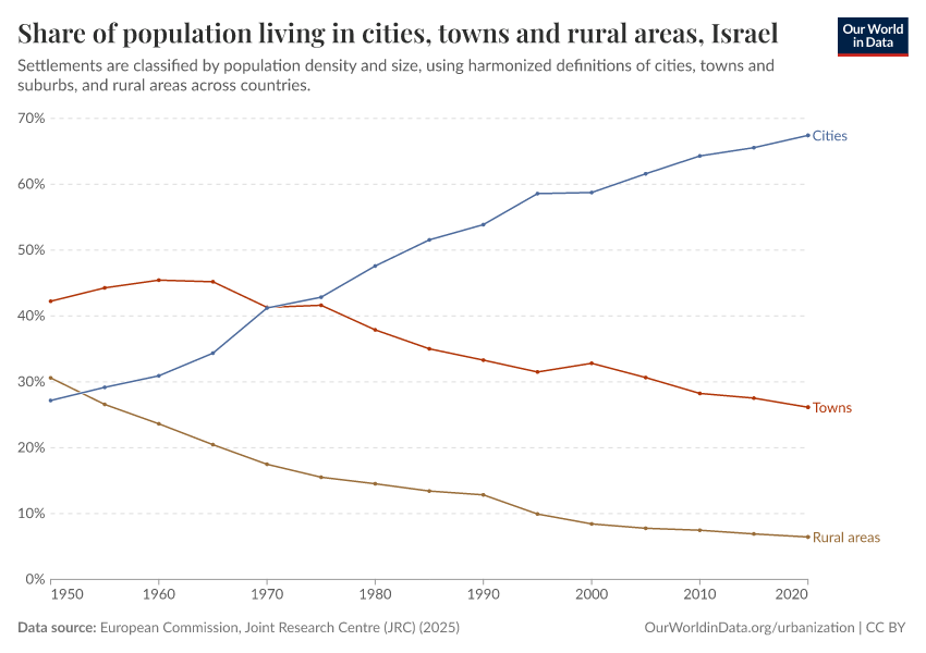In the chart, you can see how the share of people in Israel who live in rural areas, towns, and cities has changed over time.