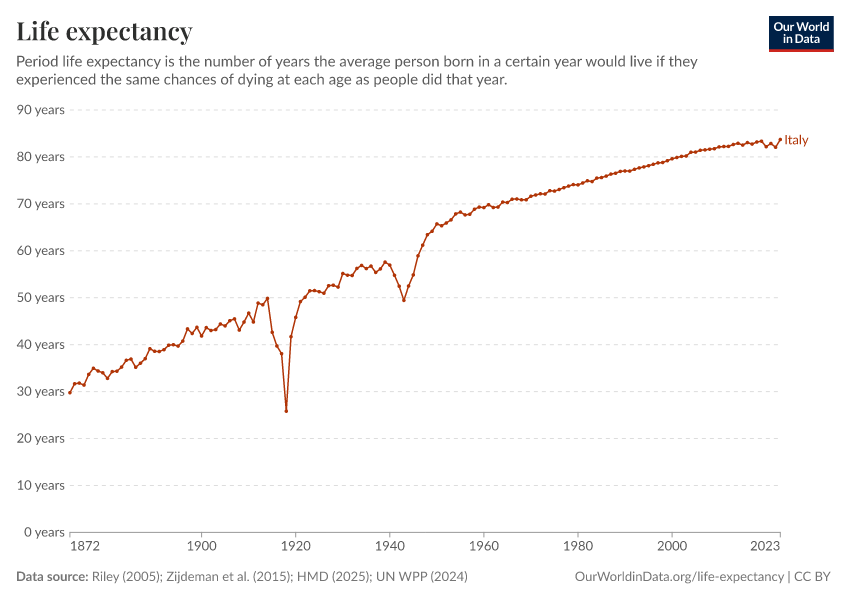 In 2023, Italy’s life expectancy at birth was 83.7 years.