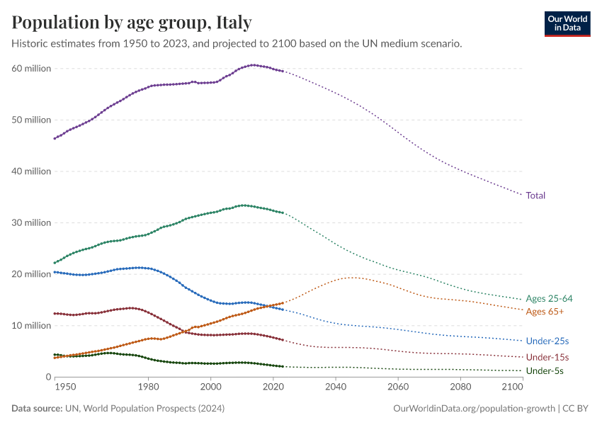 Hannah Ritchie (2026) - “Population and Demography” Published online at OurWorldinData.org. Retrieved from: 'https://ourworldindata.org/profile/population-demography/italy' [Online Resource]BibTeX citation