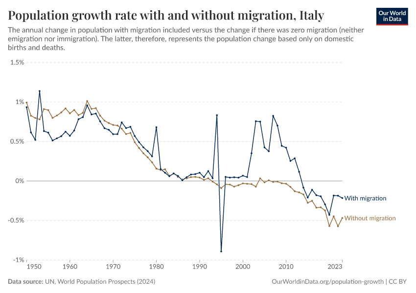 In the chart, you can see Italy’s population change with migration, next to a scenario where migration was zero. In this case, population changes would only be determined by births and deaths.