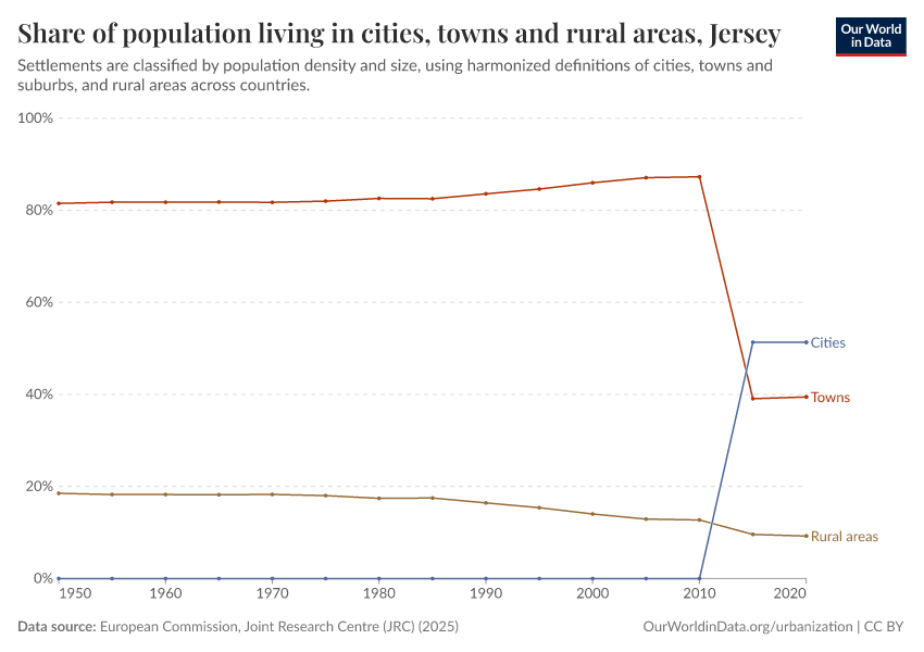 In the chart, you can see how the share of people in Jersey who live in rural areas, towns, and cities has changed over time.