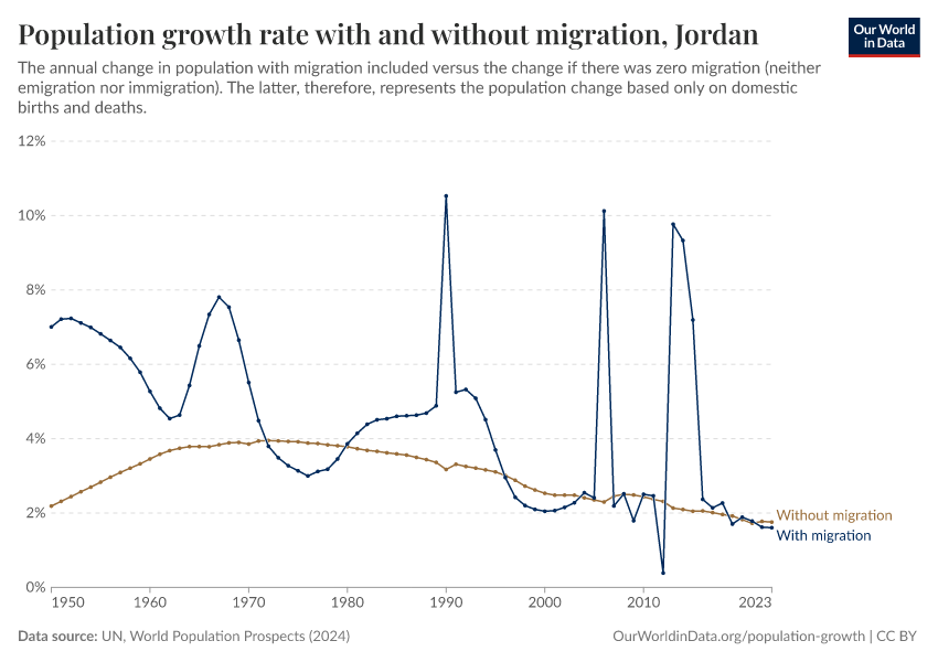 In the chart, you can see Jordan’s population change with migration, next to a scenario where migration was zero. In this case, population changes would only be determined by births and deaths.