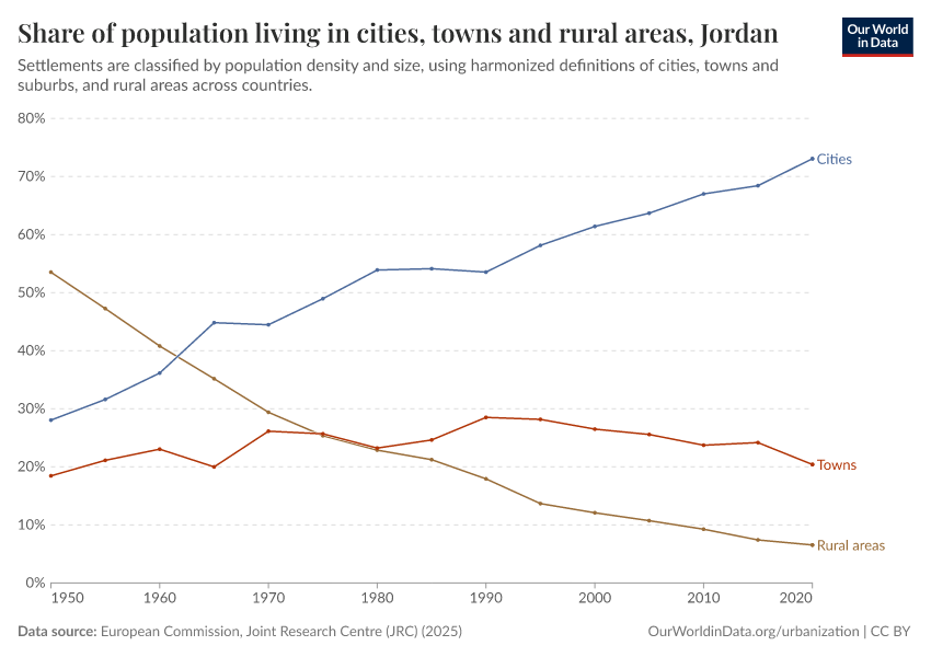 In the chart, you can see how the share of people in Jordan who live in rural areas, towns, and cities has changed over time.