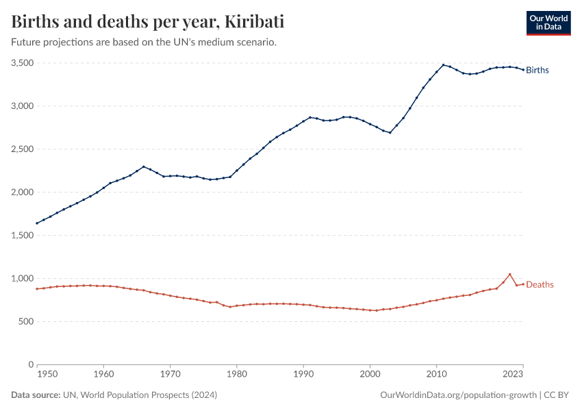 The chart below shows how births and deaths in Kiribati have changed over time.