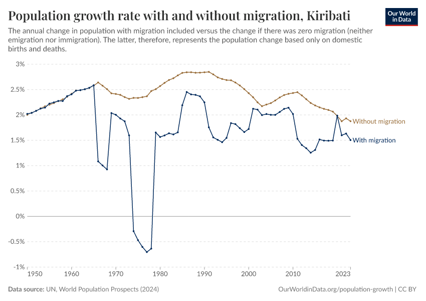 In the chart, you can see Kiribati’s population change with migration, next to a scenario where migration was zero. In this case, population changes would only be determined by births and deaths.