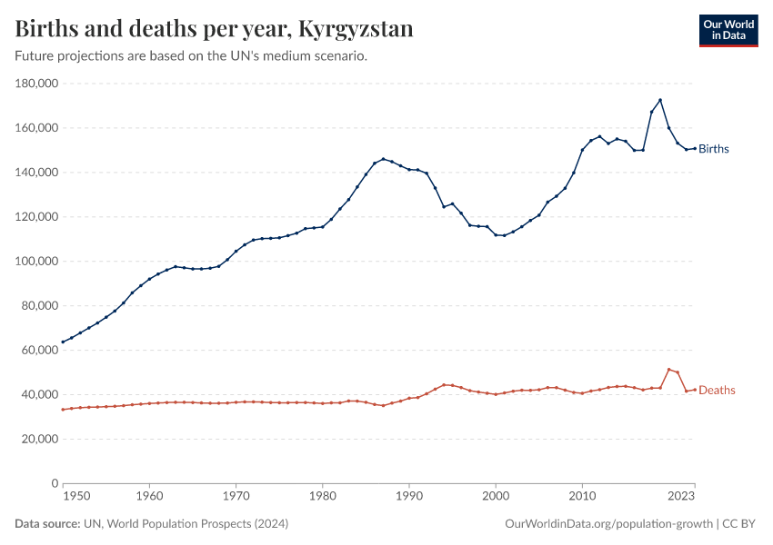 The chart below shows how births and deaths in Kyrgyzstan have changed over time.