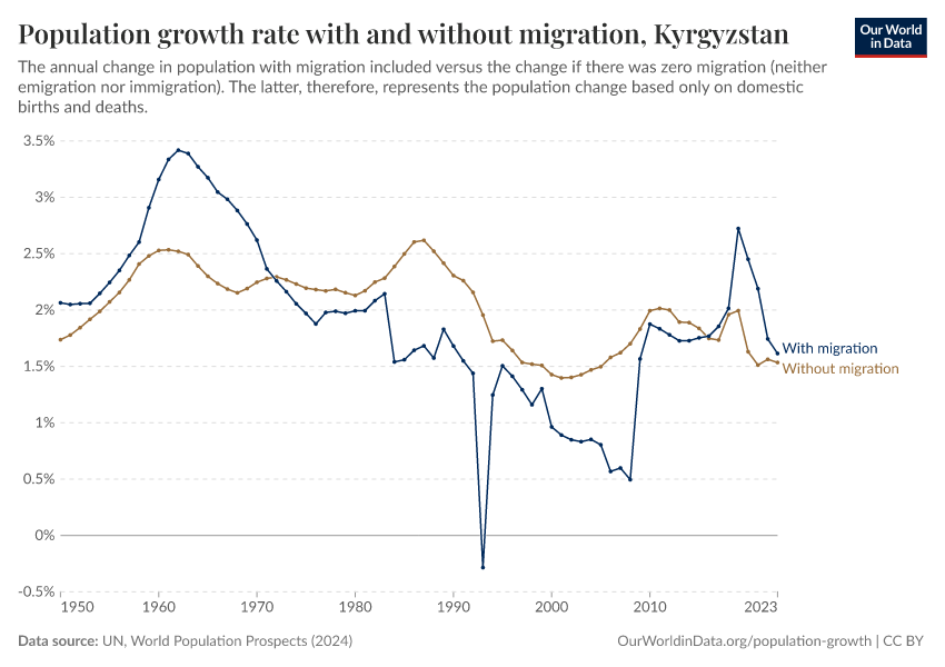 In the chart, you can see Kyrgyzstan’s population change with migration, next to a scenario where migration was zero. In this case, population changes would only be determined by births and deaths.