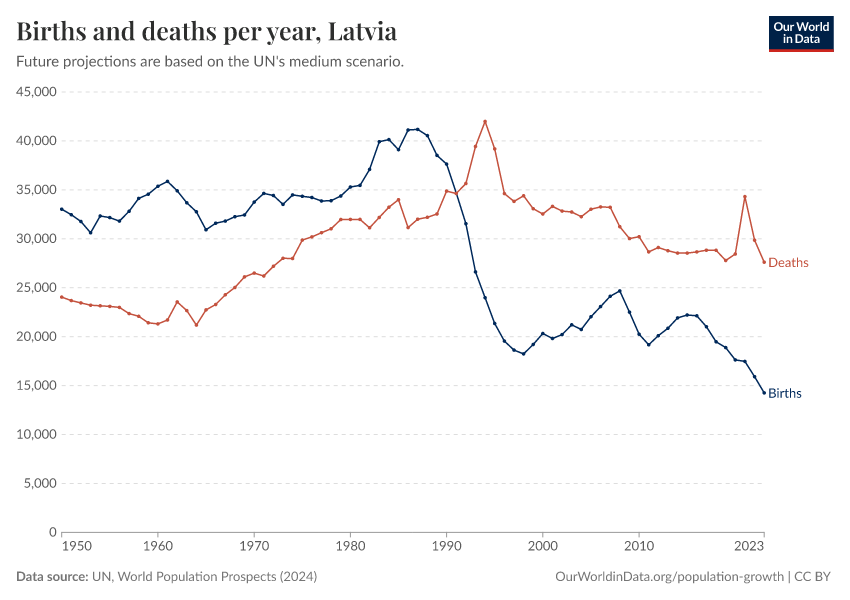 The chart below shows how births and deaths in Latvia have changed over time.