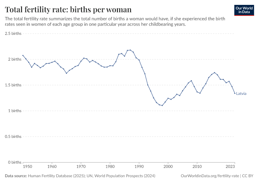 In 2023, Latvia’s total fertility rate was 1.34 births per woman.