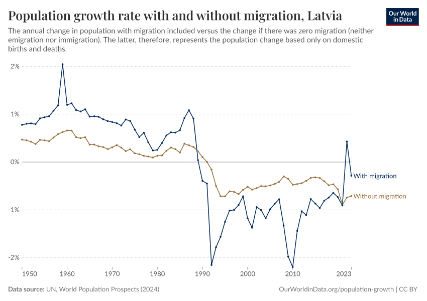 In the chart, you can see Latvia’s population change with migration, next to a scenario where migration was zero. In this case, population changes would only be determined by births and deaths.
