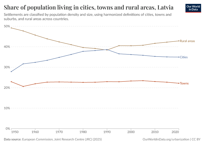 In the chart, you can see how the share of people in Latvia who live in rural areas, towns, and cities has changed over time.