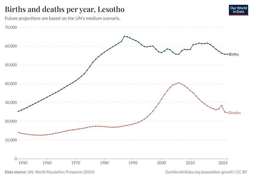 The chart below shows how births and deaths in Lesotho have changed over time.