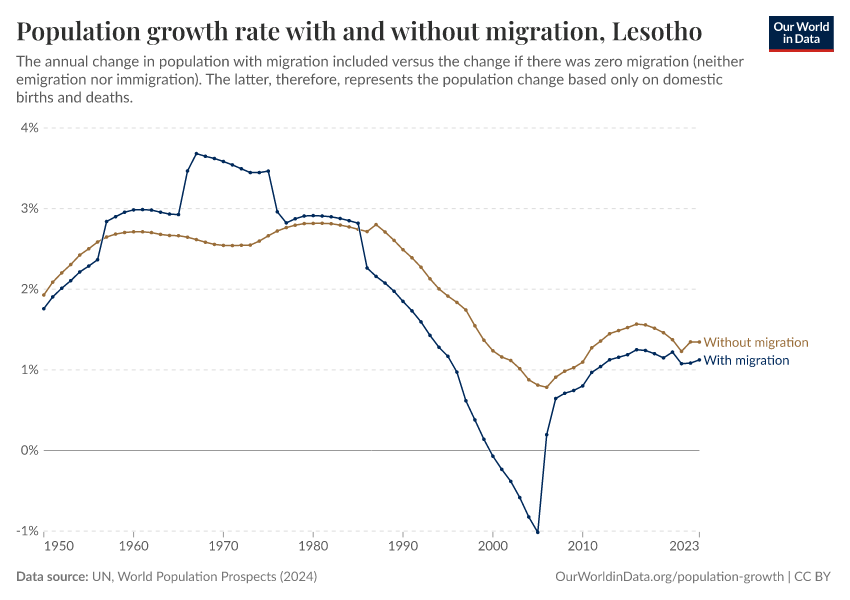In the chart, you can see Lesotho’s population change with migration, next to a scenario where migration was zero. In this case, population changes would only be determined by births and deaths.