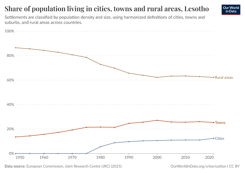 In the chart, you can see how the share of people in Lesotho who live in rural areas, towns, and cities has changed over time.