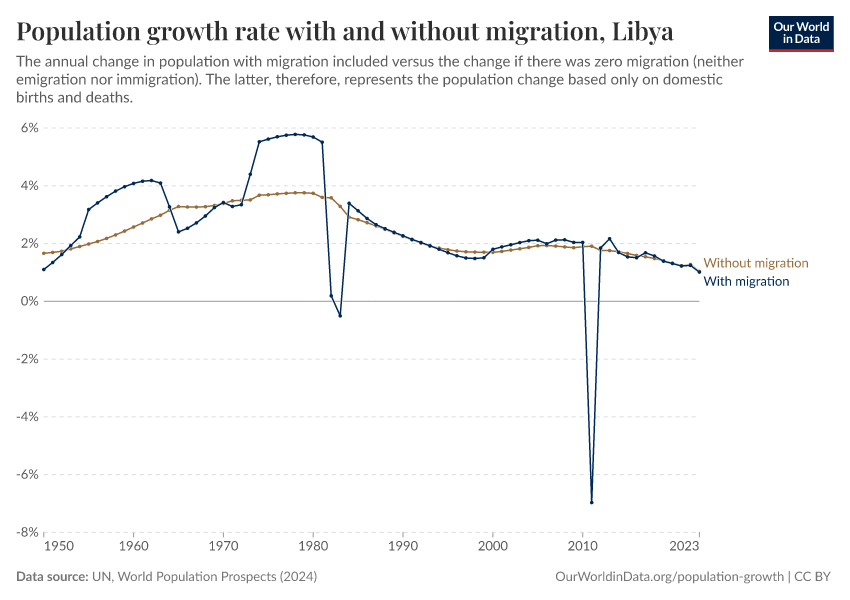 In the chart, you can see Libya’s population change with migration, next to a scenario where migration was zero. In this case, population changes would only be determined by births and deaths.