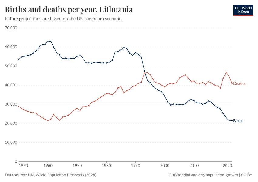 The chart below shows how births and deaths in Lithuania have changed over time.