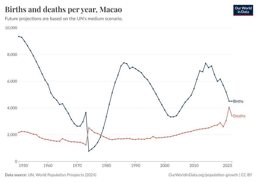 The chart below shows how births and deaths in Macao have changed over time.