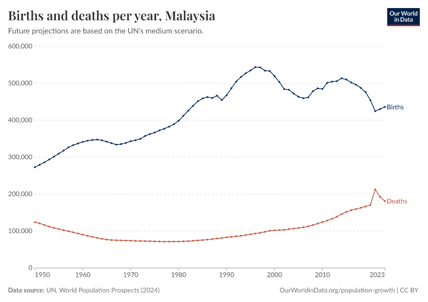 The chart below shows how births and deaths in Malaysia have changed over time.