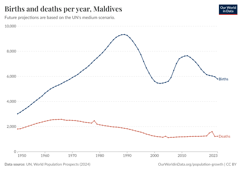 The chart below shows how births and deaths in the Maldives have changed over time.