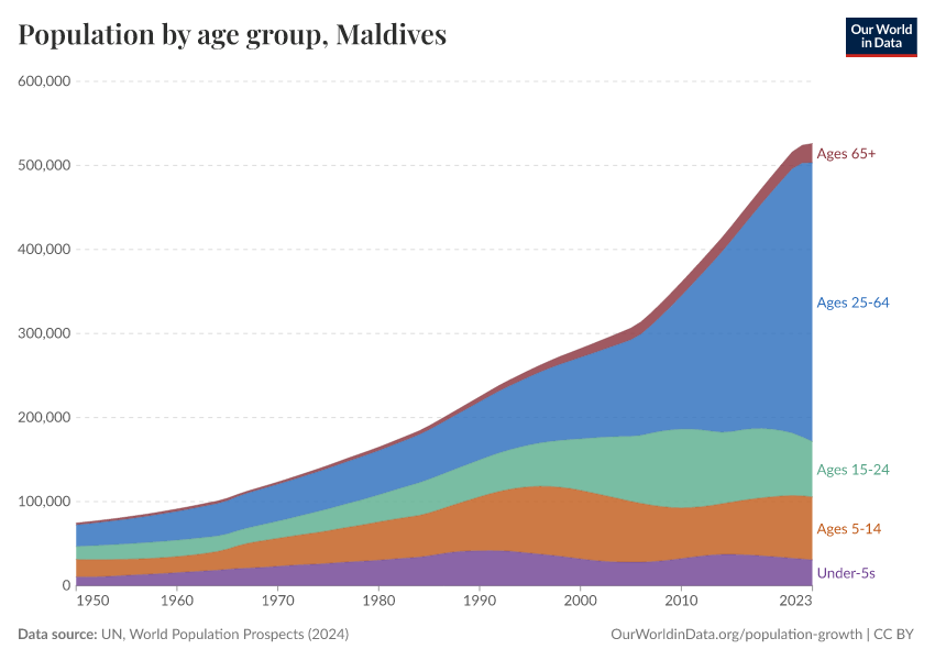 The chart shows the Maldives’ population broken down by age, and how this has changed over time.