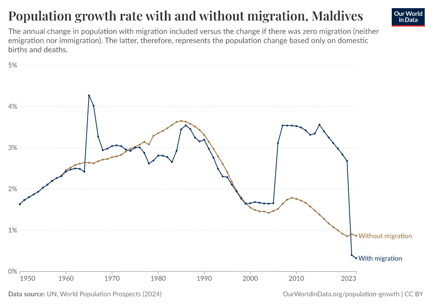 In the chart, you can see the Maldives’ population change with migration, next to a scenario where migration was zero. In this case, population changes would only be determined by births and deaths.