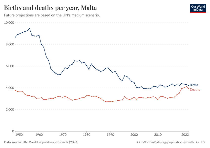 The chart below shows how births and deaths in Malta have changed over time.