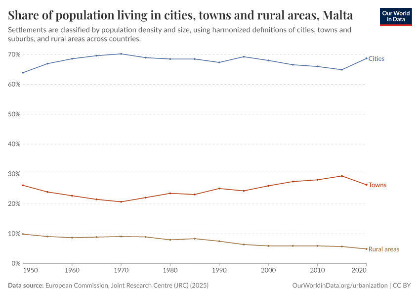 In the chart, you can see how the share of people in Malta who live in rural areas, towns, and cities has changed over time.