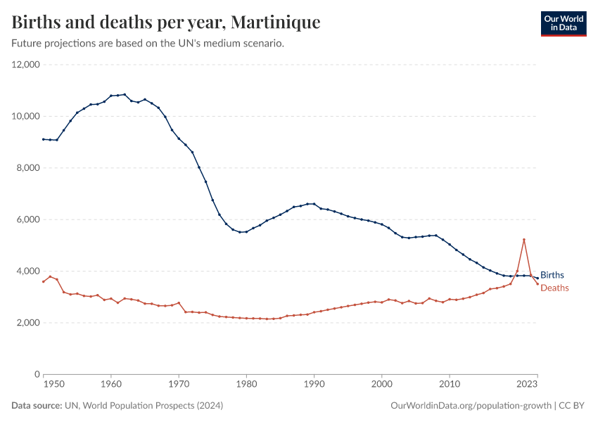 The chart below shows how births and deaths in Martinique have changed over time.