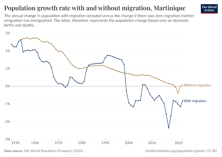 In the chart, you can see Martinique’s population change with migration, next to a scenario where migration was zero. In this case, population changes would only be determined by births and deaths.