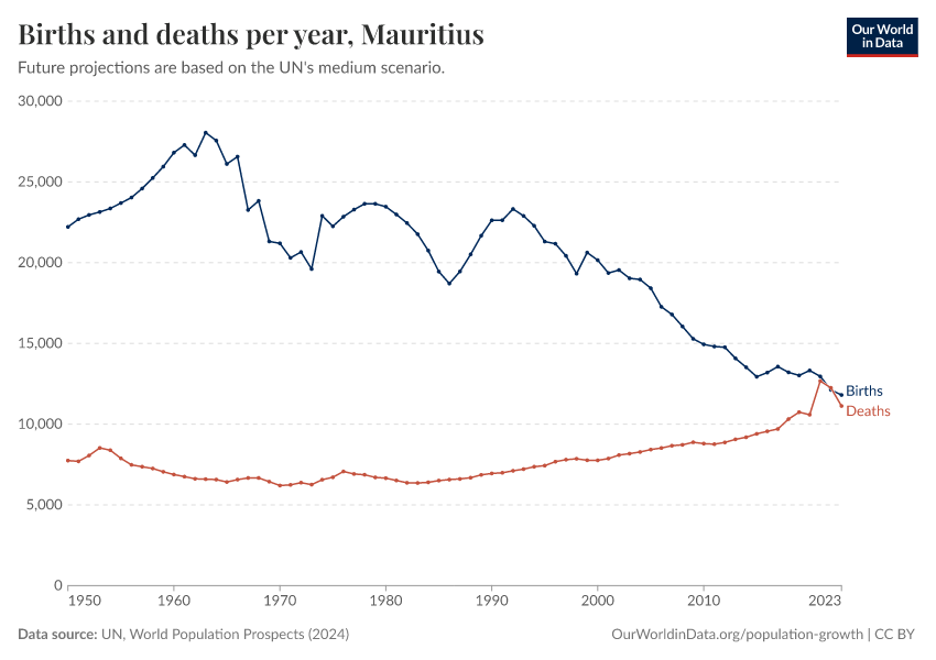 The chart below shows how births and deaths in Mauritius have changed over time.