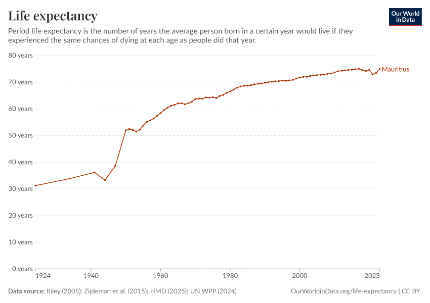 In 2023, Mauritius’ life expectancy at birth was 74.9 years.