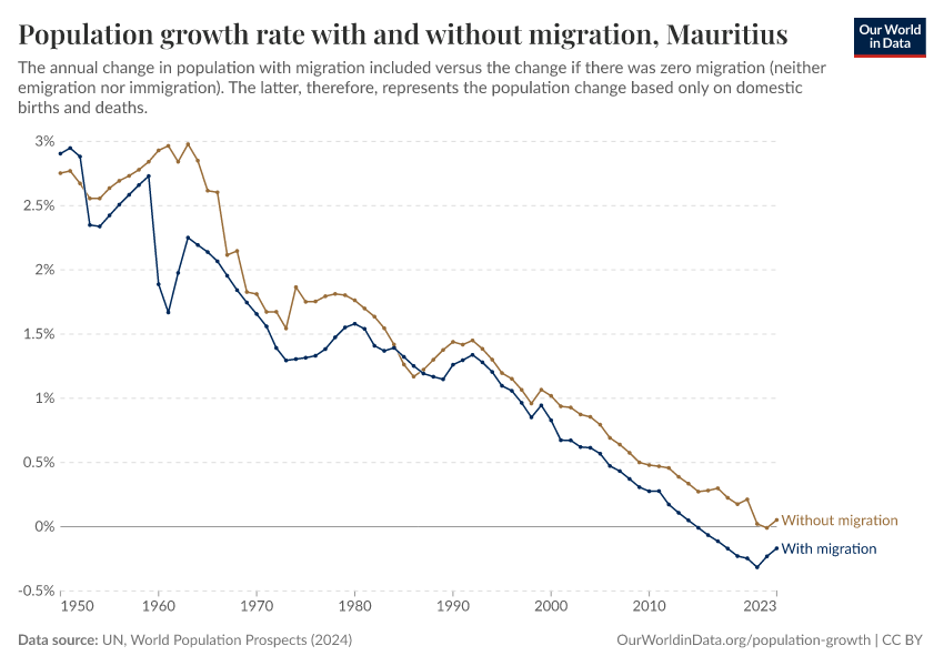 In the chart, you can see Mauritius’ population change with migration, next to a scenario where migration was zero. In this case, population changes would only be determined by births and deaths.