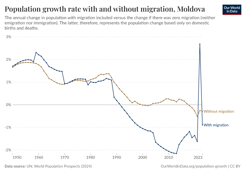 In the chart, you can see Moldova’s population change with migration, next to a scenario where migration was zero. In this case, population changes would only be determined by births and deaths.