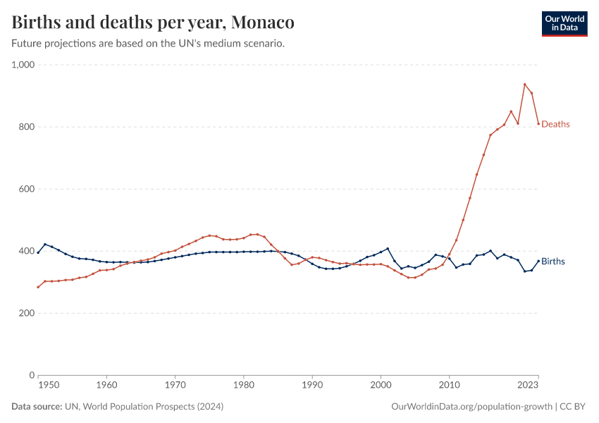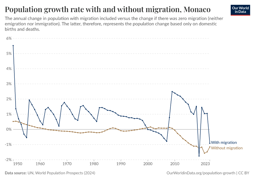 In the chart, you can see Monaco’s population change with migration, next to a scenario where migration was zero. In this case, population changes would only be determined by births and deaths.