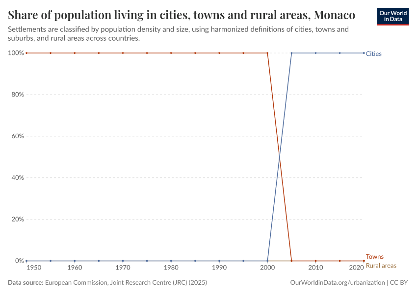 In the chart, you can see how the share of people in Monaco who live in rural areas, towns, and cities has changed over time.