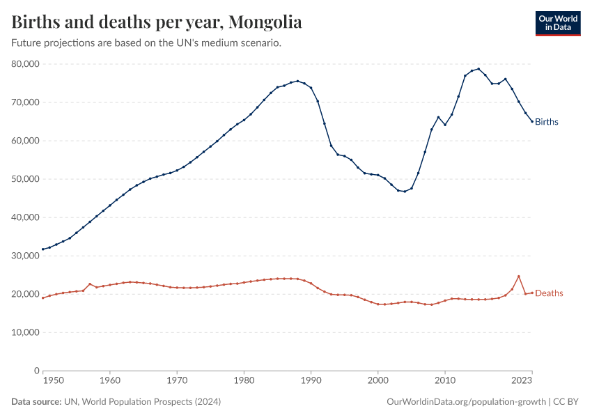 The chart below shows how births and deaths in Mongolia have changed over time.
