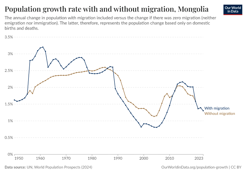 In the chart, you can see Mongolia’s population change with migration, next to a scenario where migration was zero. In this case, population changes would only be determined by births and deaths.