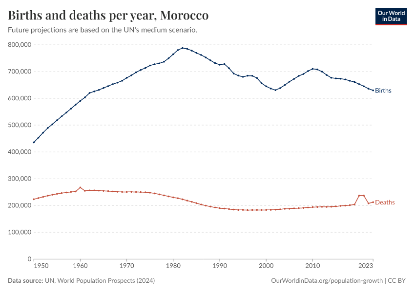The chart below shows how births and deaths in Morocco have changed over time.