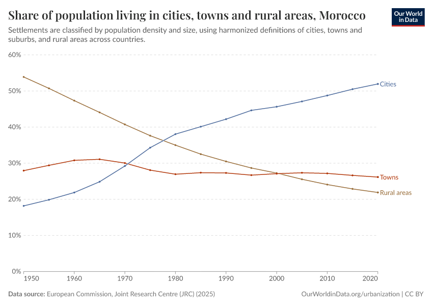 In the chart, you can see how the share of people in Morocco who live in rural areas, towns, and cities has changed over time.