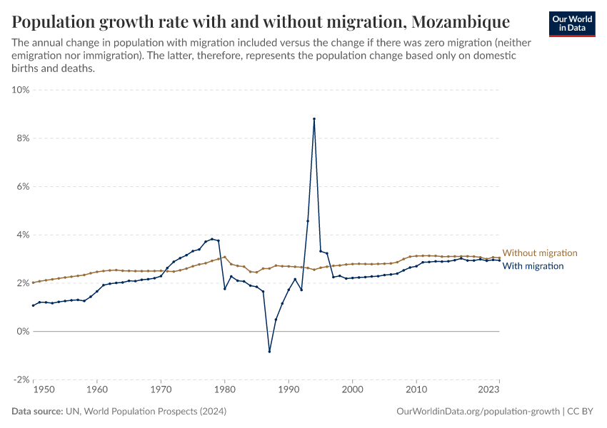 In the chart, you can see Mozambique’s population change with migration, next to a scenario where migration was zero. In this case, population changes would only be determined by births and deaths.