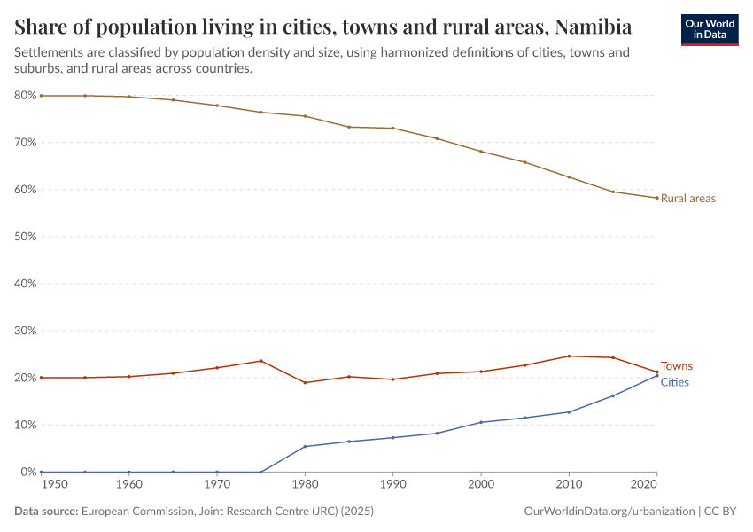In the chart, you can see how the share of people in Namibia who live in rural areas, towns, and cities has changed over time.