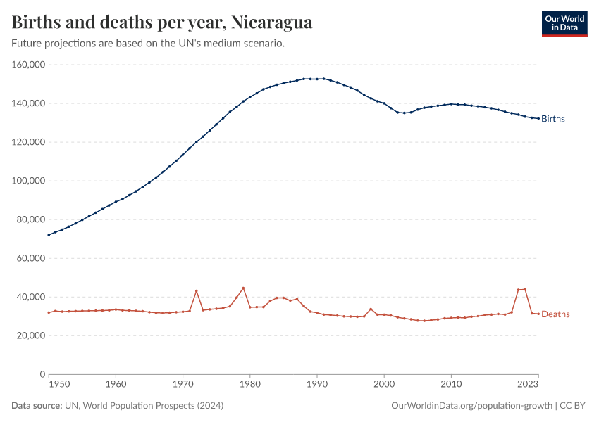 The chart below shows how births and deaths in Nicaragua have changed over time.
