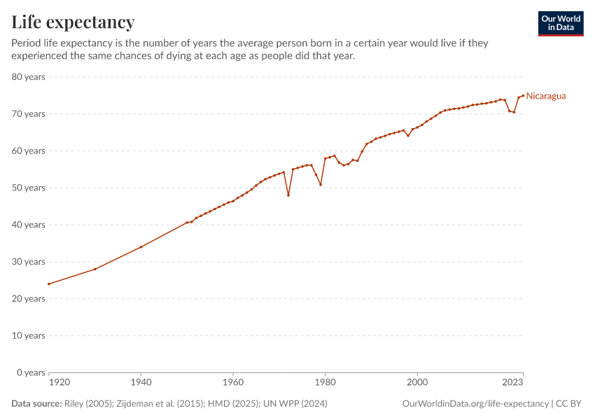 In 2023, Nicaragua’s life expectancy at birth was 74.9 years.