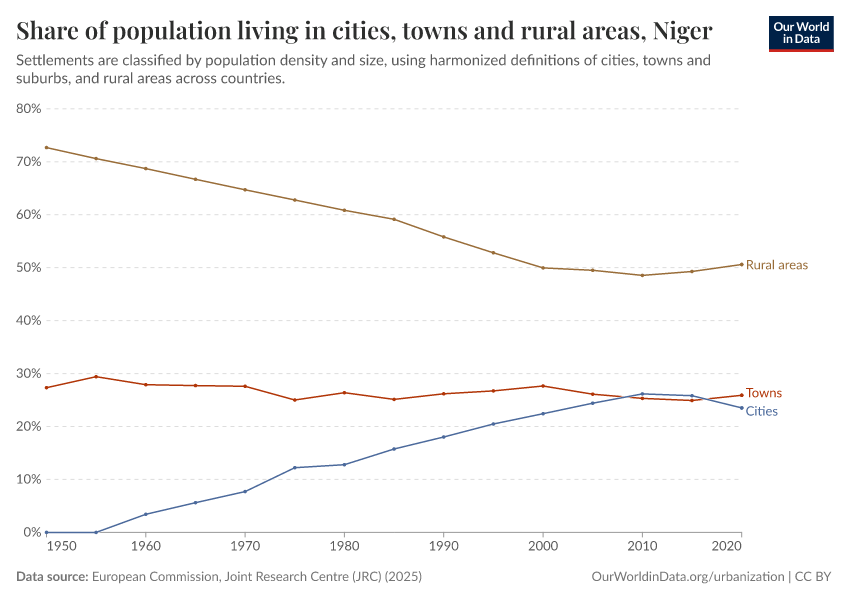 In the chart, you can see how the share of people in Niger who live in rural areas, towns, and cities has changed over time.