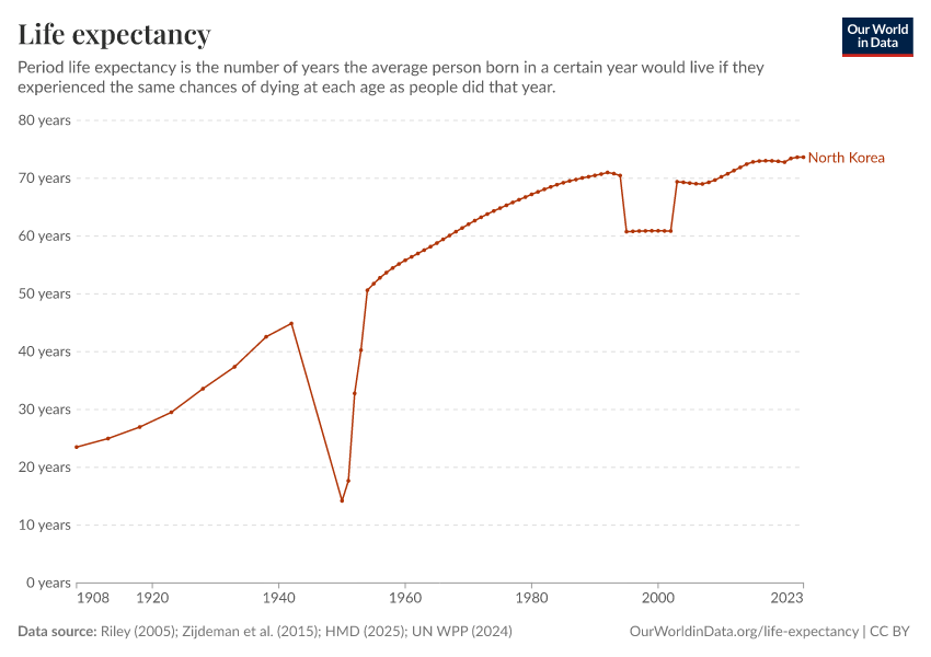 In 2023, North Korea’s life expectancy at birth was 73.6 years.