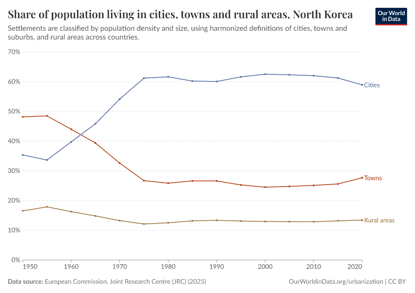In the chart, you can see how the share of people in North Korea who live in rural areas, towns, and cities has changed over time.