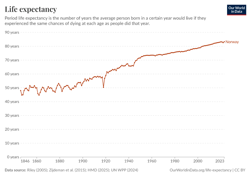 In 2023, Norway’s life expectancy at birth was 83.3 years.