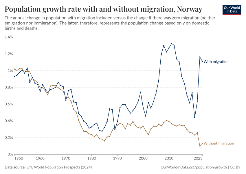 In 2023, Norway’s population growth rate was 1.11%, and the chart shows how this has changed over time.